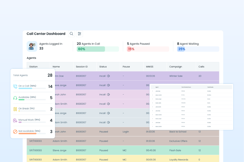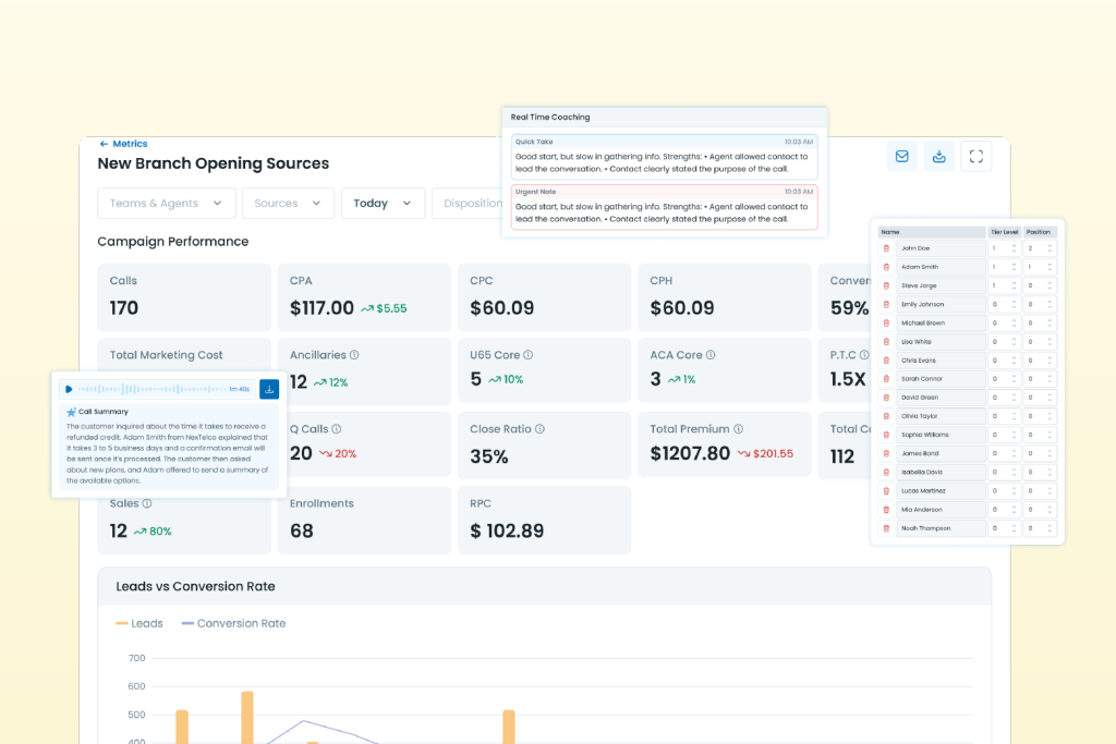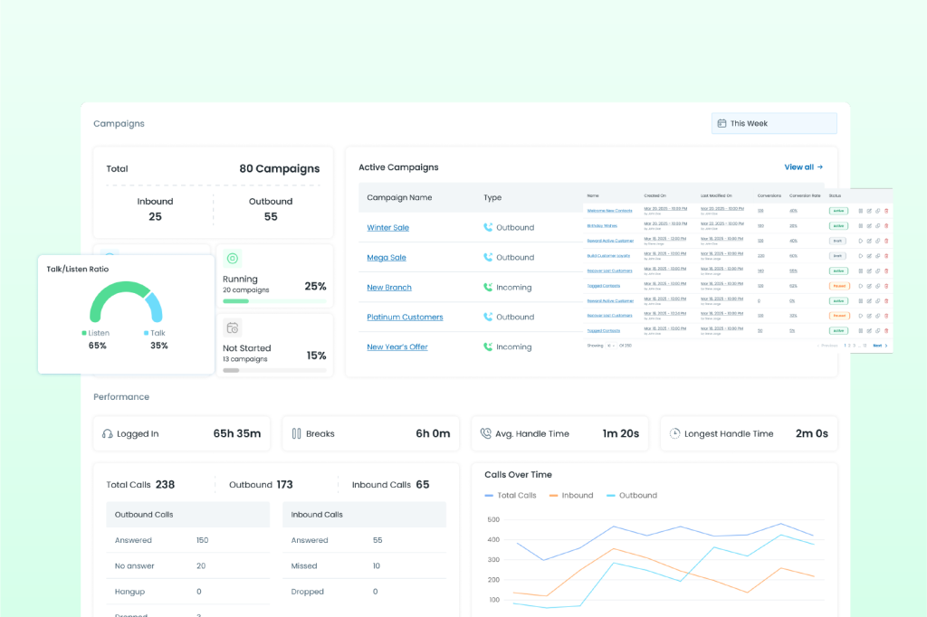 Our system enables real-time and historical insights such as - Real-time dashboards, a Custom report builder, Voice analytics, and Customer satisfaction metrics (CSAT, NPS, CES).