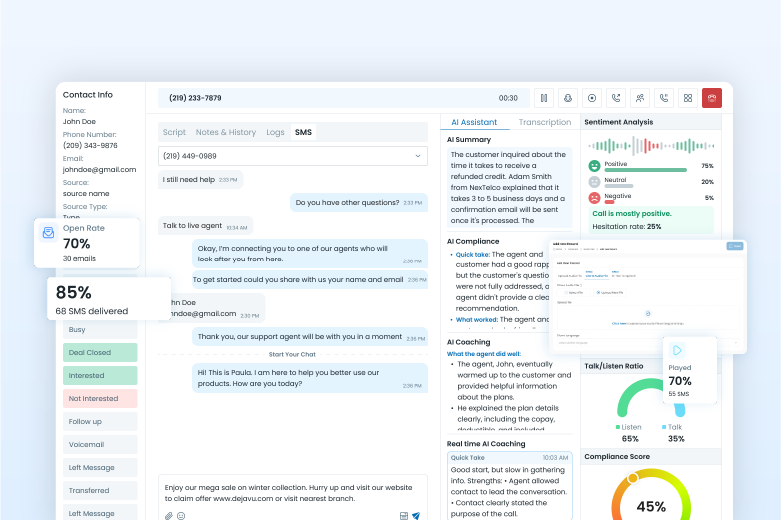 NexTelco is a comprehensive VoIP (Voice over IP) communication platform that provides businesses with a range of services including call management, SMS, voicemail, campaign management, analytics, and more. It helps streamline your business communications, improve efficiency, and enhance customer engagement.