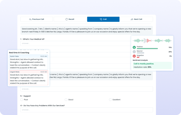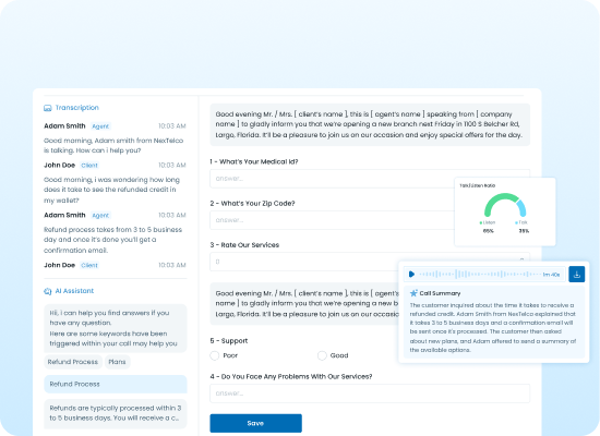 Boost agent efficiency with automated call summaries, real-time transcription, sentiment detection, AI coaching, and actionable insights for better conversations and follow-ups.