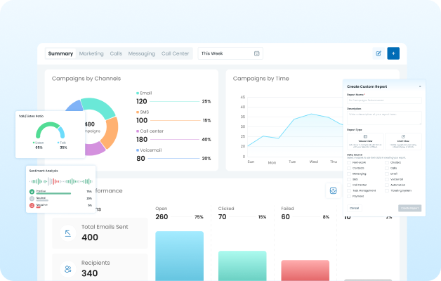 Access real-time dashboards, custom reports, voice analytics, and AI-powered insights. Track performance, understand customer behavior, and make data-driven decisions faster.